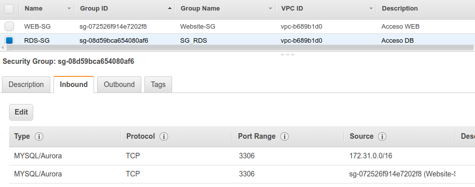 RDS-SG en el que vamos a dar acceso al servicio MySql con el origen del Security Group Web-SG, esto es, las peticiones a la base de datos podrán llegar únicamente desde el frontal web.