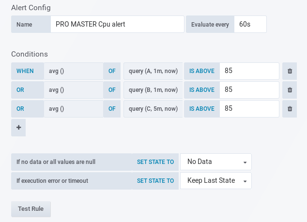 Se refieren a si se generaran alarmas cuando no se encuentren datos en la base de datos de series para este panel, o bien tenemos un timeout con la base de datos de métricas. Pueden ser muy útiles ya que una ausencia de datos puede significar algo importante, por ejemplo, un "hueco" en la recepción de datos de un punto de montaje en NFS nos puede indicar que el servicio de NFS se ha podido caer.. y así con muchas más cosas. Aunque también es verdad que la mayoría de las alarmas que se generen por esta falta de datos serán, casi en su totalidad, falsos positivos ocasionados por la perdida de conexión entre Grafana e InfluxDB.