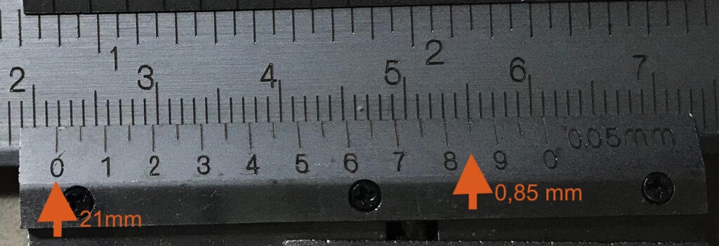 Buscamos el 0, veos que está entre las marcas de la regla fija, entre la marca de 21 y 22 mm, por tanto tendremos una medida de 21mm más algo más. Ahora miramos las marcas del Nonio y buscamos la que mejor coincide con las de la regla (aquí es donde encontraremos diferencias entre un calibre de 0.02 y otro de 0.05 pues en el primero tendremos muchas más marcas), en este caso es la de 8,5, por tanto serán 0.85 mm. Por tanto la medida que hemos tomado es de 21.85mm