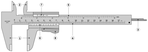 1. Palpadores de exteriores (nos permite tomar medidas exteriores al objeto) 2. Palpadores de interiores (nos permite tomar medidas interiores del objeto) 3. Sonda de profundidad (nos permite tomar medida de la profundidad) 4 y 5. Regla graduada (en mm y en pulgadas) 6 y 7. Nonio o vernier (en mm y en pulgadas) 8. Botón de desplazamiento (si no presionamos no se moverá y nos permite "bloquear" la lectura)