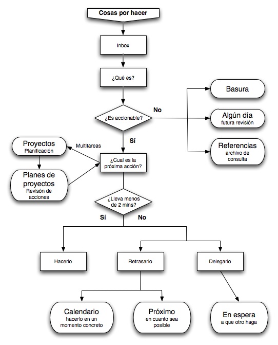 Algunos ejemplos, este proceso para la productividad GTP ( Getting Things Done ) que no es más que la forma que se pueden mover nuestras tareas desde múltiples entradas hasta la finalización de la tarea (sea por realizacion, por eliminación, etc.)