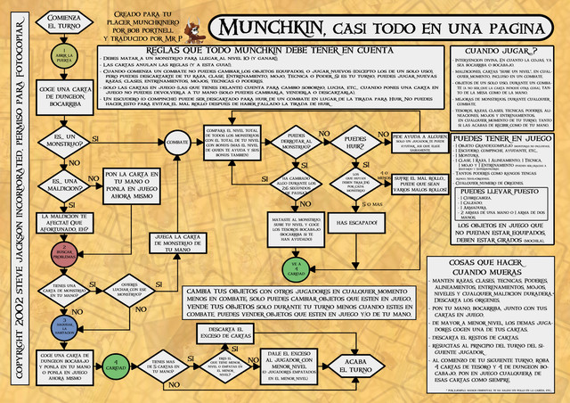 Incluso en otros ámbitos, como son los juegos de mesa, el uso de diagamas de flujo está muy extendido y nos ayuda a saber el camino que debemos seguir (flujo) a lo largo del juego según se desarrollen los acontecimientos en el mismo (decisiones). Como ejemplo aquí el diagrama para jugar a Munchkin que sin tener que explicar a nadie la norma ISO al respecto de estos diagramas será capaz de seguirlo sin problemas.